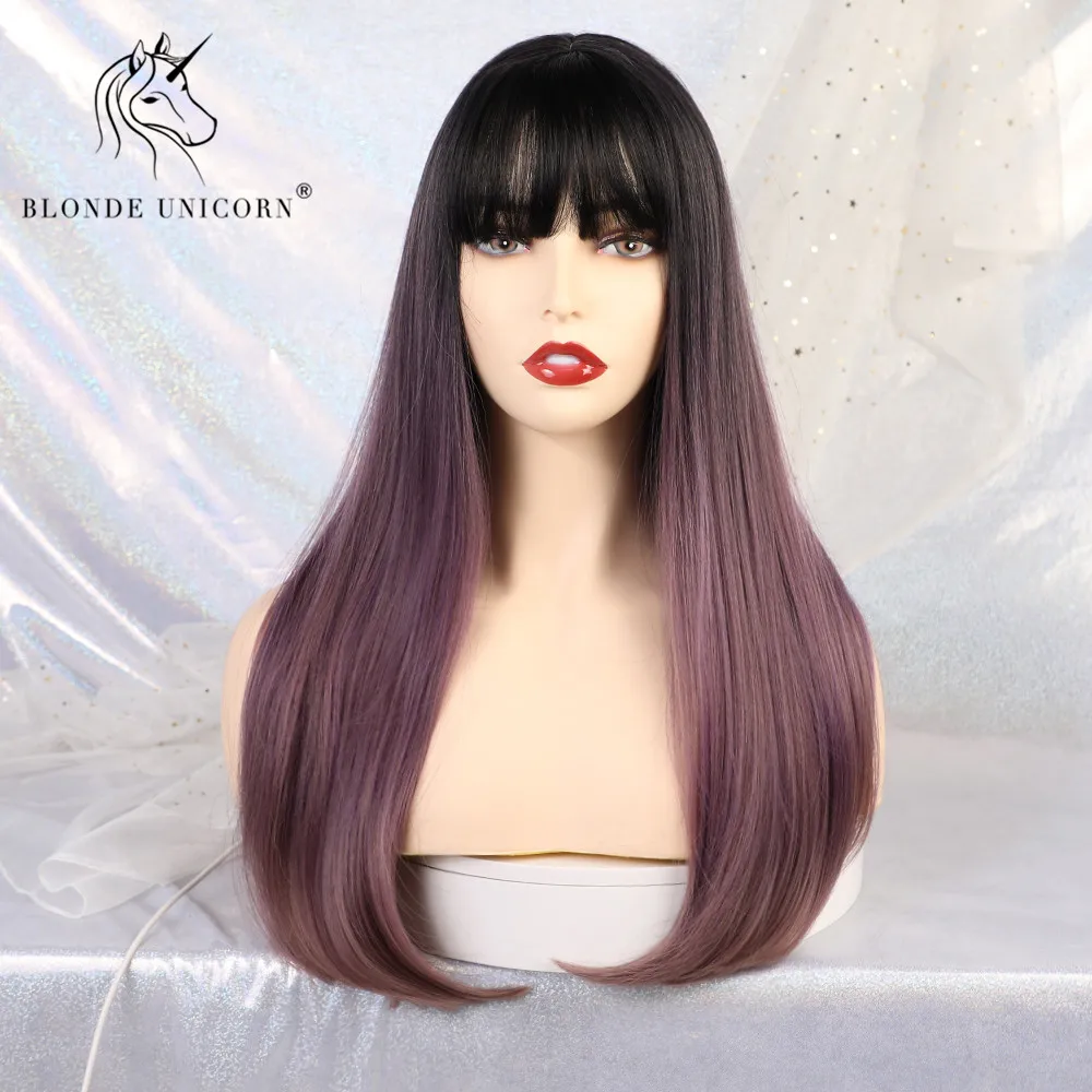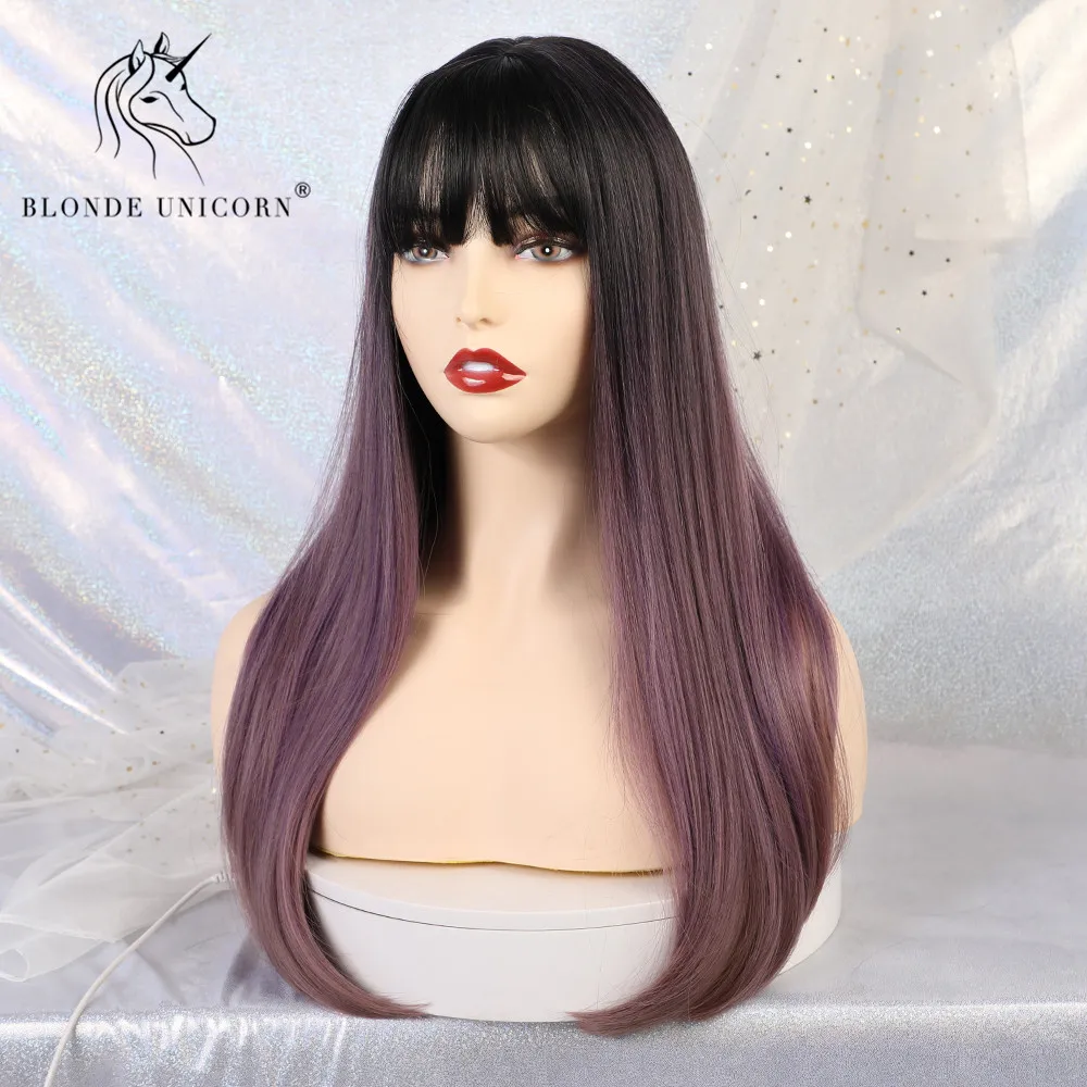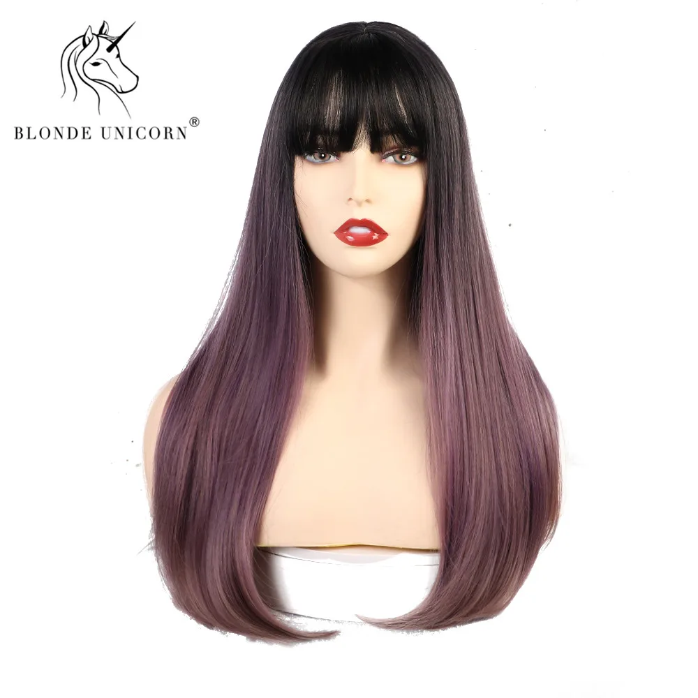 HIGH QUALITY Blonde Unicorn Synthetic Long Straight Hair Dark Root Ombre Purple Cosplay Wigs with Neat Bangs for