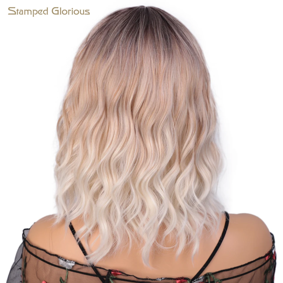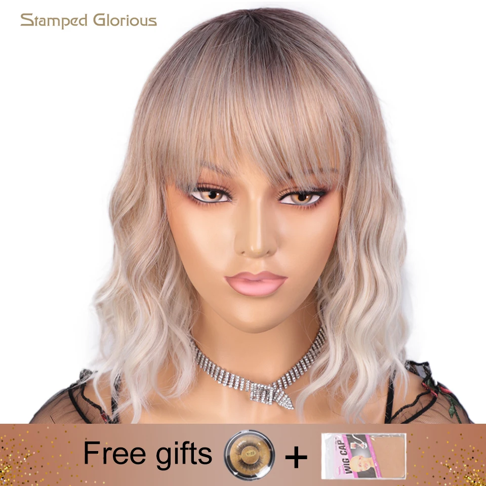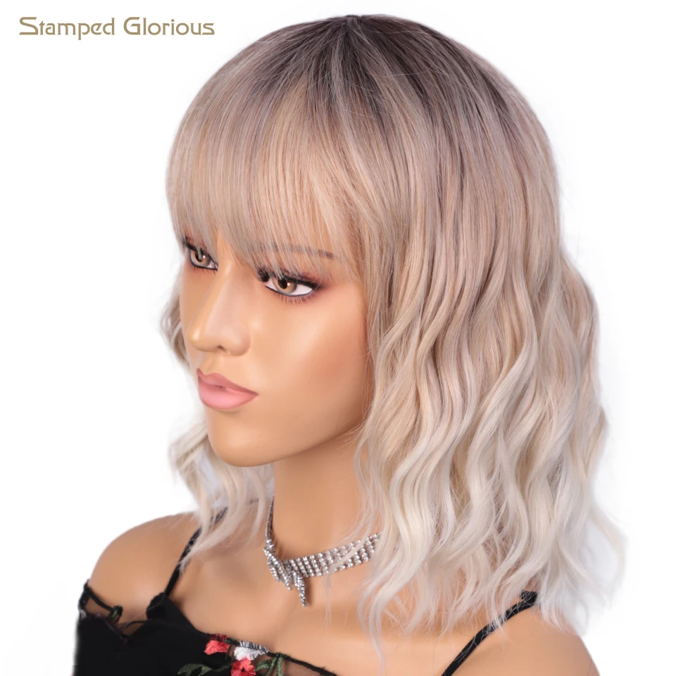 Stamped Glorious Curly Bob Wig with Bangs Brown to Blonde Short Wig 3 Tone Ombre Wig Natural wavy H